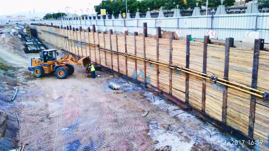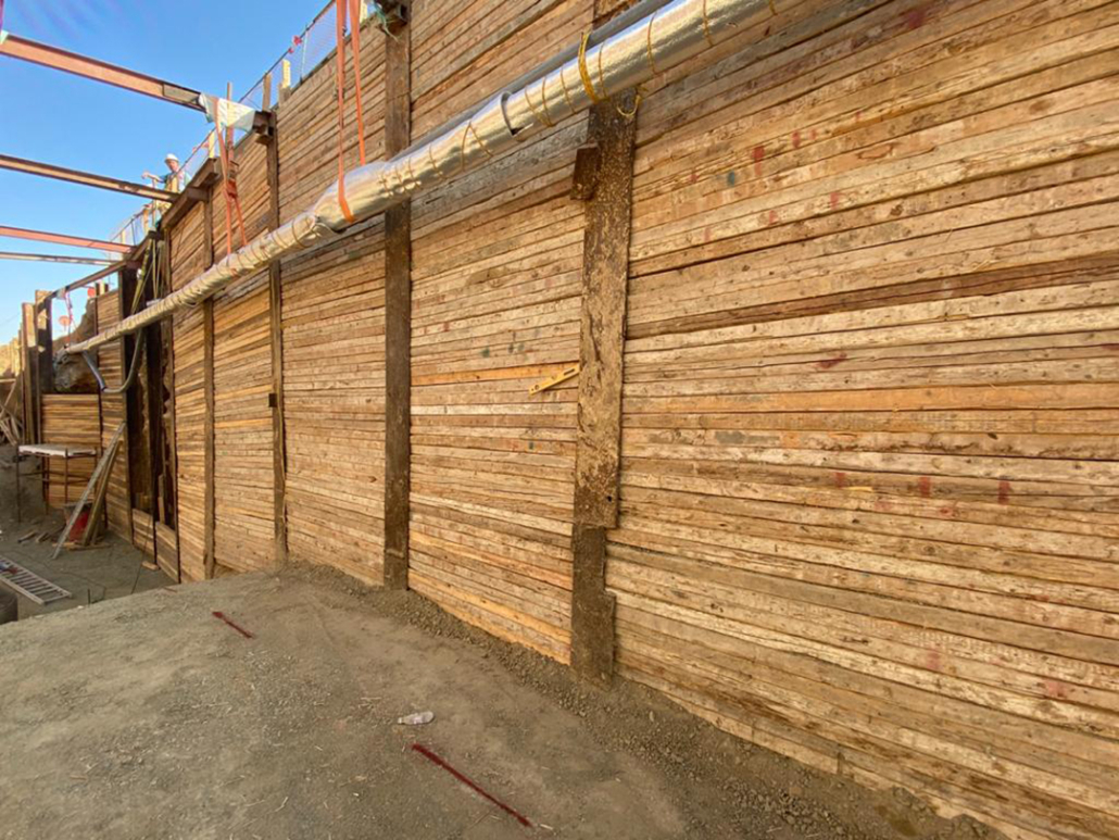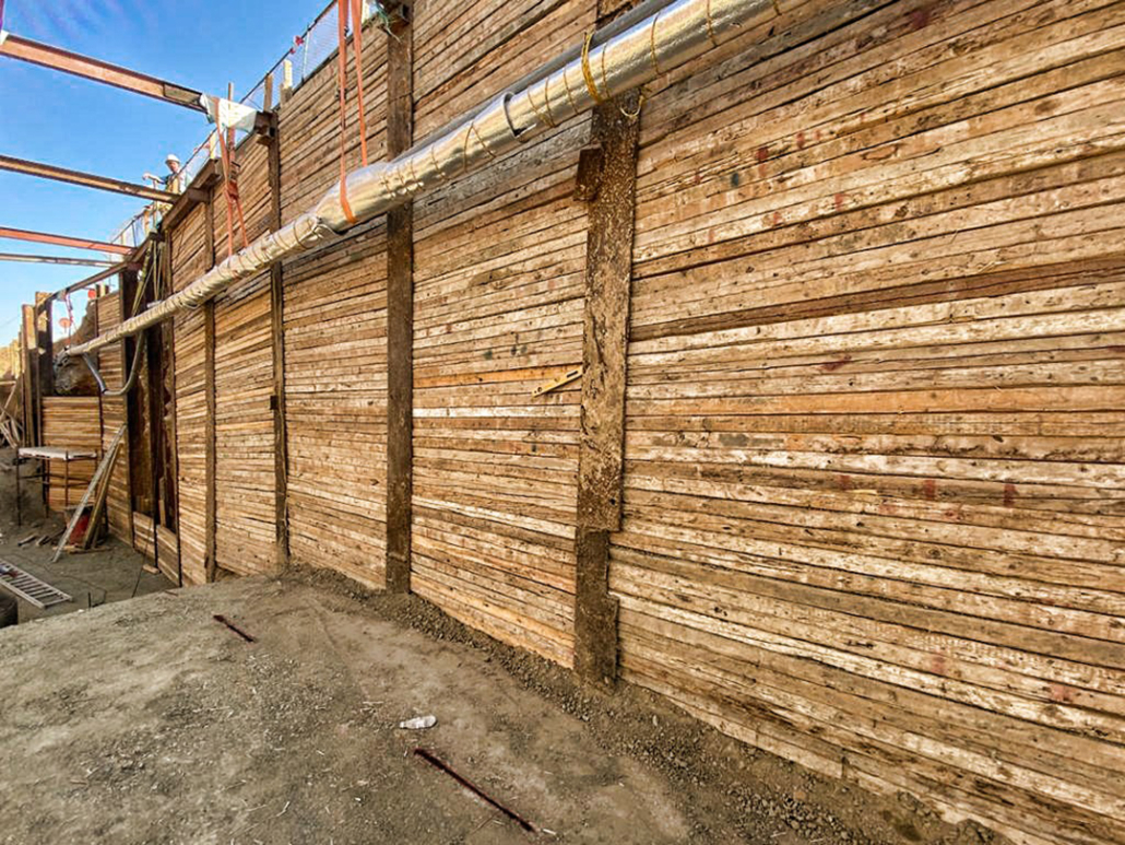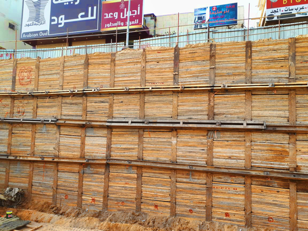 يُعد نظام الأوتاد والكمرات الخشبية (Soldier Pile and Lagging System) من أشهر أنظمة السند المؤقت والدائم لجوانب الحفر، خاصة في المناطق العمرانية الضيقة. يتكوّن من أوتاد فولاذية رأسية تُغرس على مسافات متساوية، وتُركّب بينها ألواح أفقية (Lagging) أثناء تقدم الحفر لتدعيم التربة.
