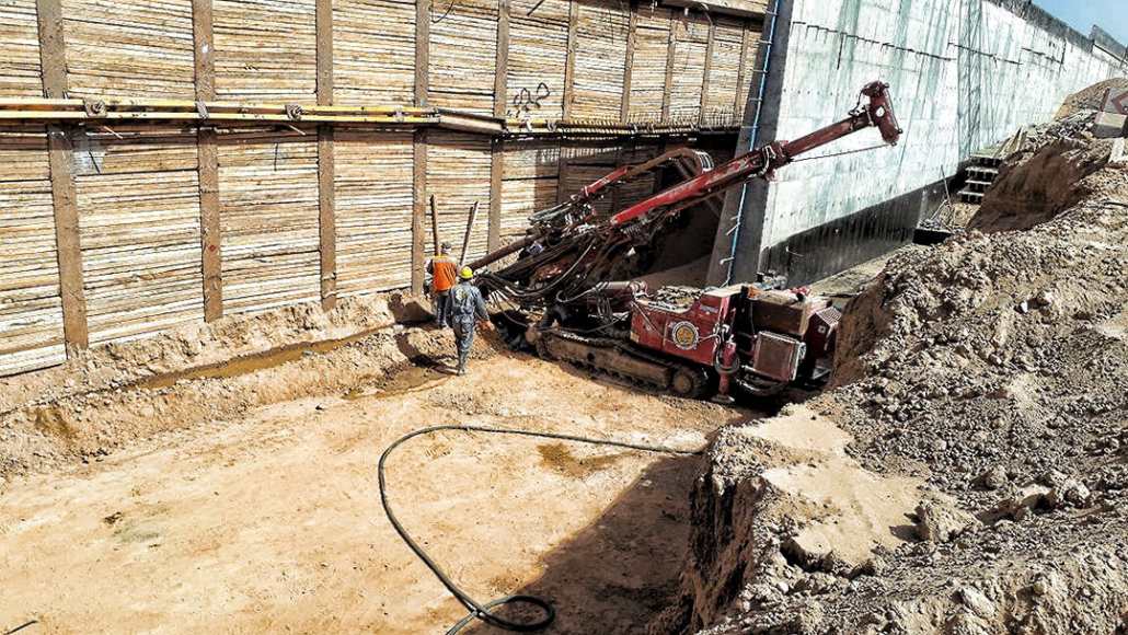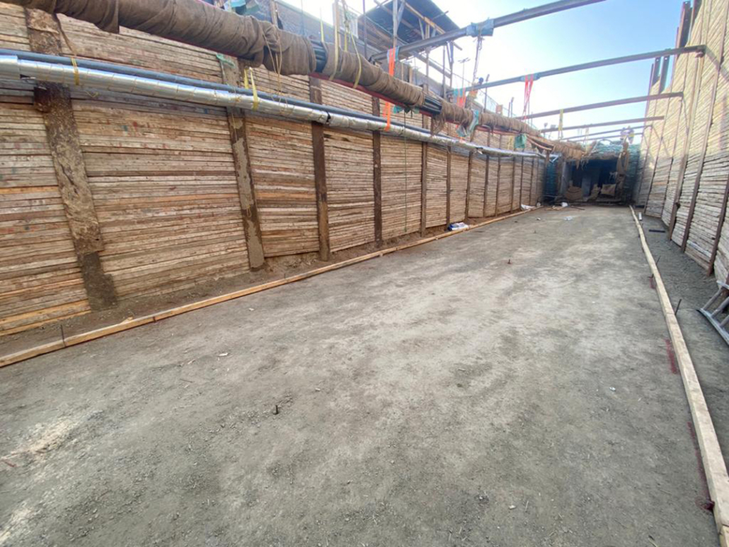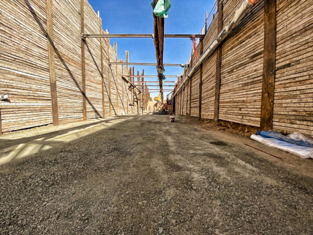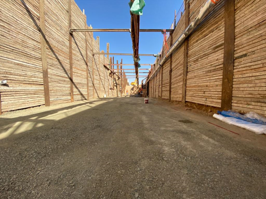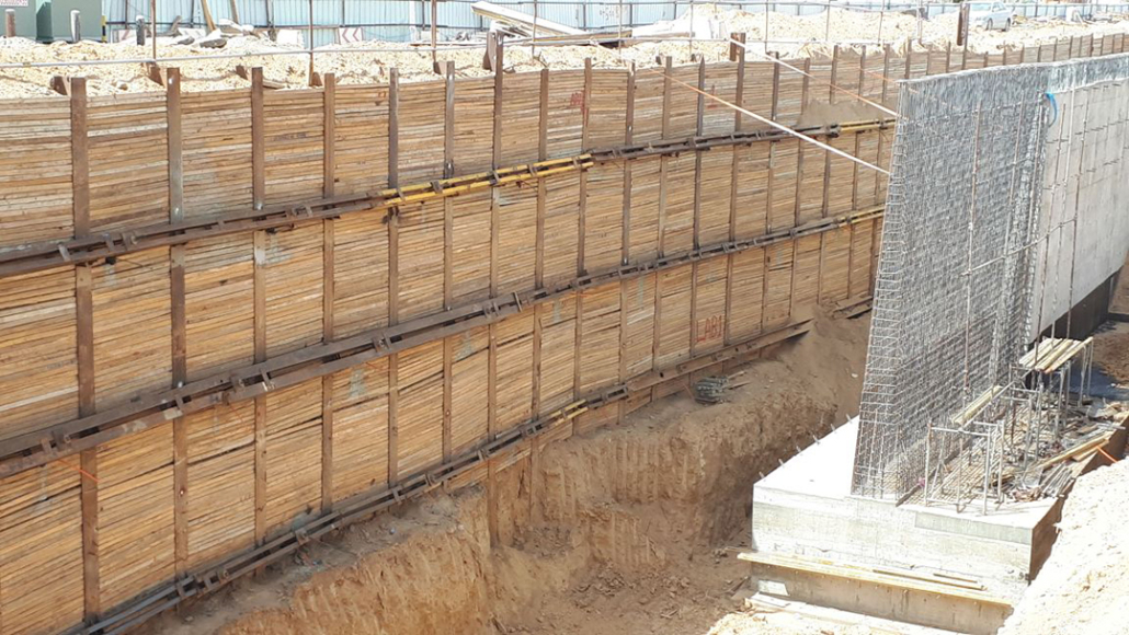 يُعد نظام الأوتاد والكمرات الخشبية (Soldier Pile and Lagging System) من أشهر أنظمة السند المؤقت والدائم لجوانب الحفر، خاصة في المناطق العمرانية الضيقة. يتكوّن من أوتاد فولاذية رأسية تُغرس على مسافات متساوية، وتُركّب بينها ألواح أفقية (Lagging) أثناء تقدم الحفر لتدعيم التربة.